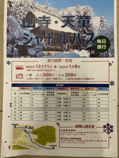 期間限定になりますが、山寺と天童を結ぶシャトルバス(ワゴン車)が運行します。